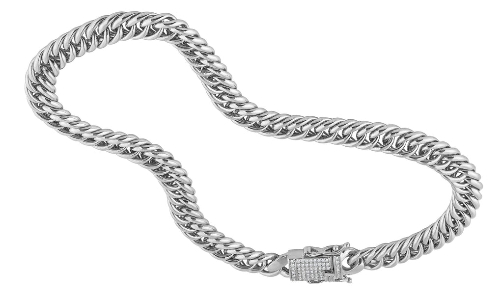 Design: Corrente estruturada de elos duplos, com fecho de encaixe cravejado. Brilho intenso e acabamento polido para composições marcantes.