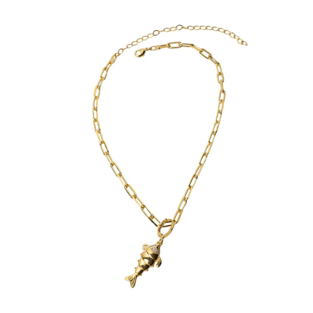 Com inspiração simbólica e estética contemporânea, o Colar Peixe Dourado é uma semijoia que traduz leveza, movimento e significado. O pingente em formato de peixe, com desenho detalhado e acabamento elegante, traz um visual marcante e atual. O banho em ouro 18K valoriza a peça com brilho sofisticado, criando um destaque delicado no colo.