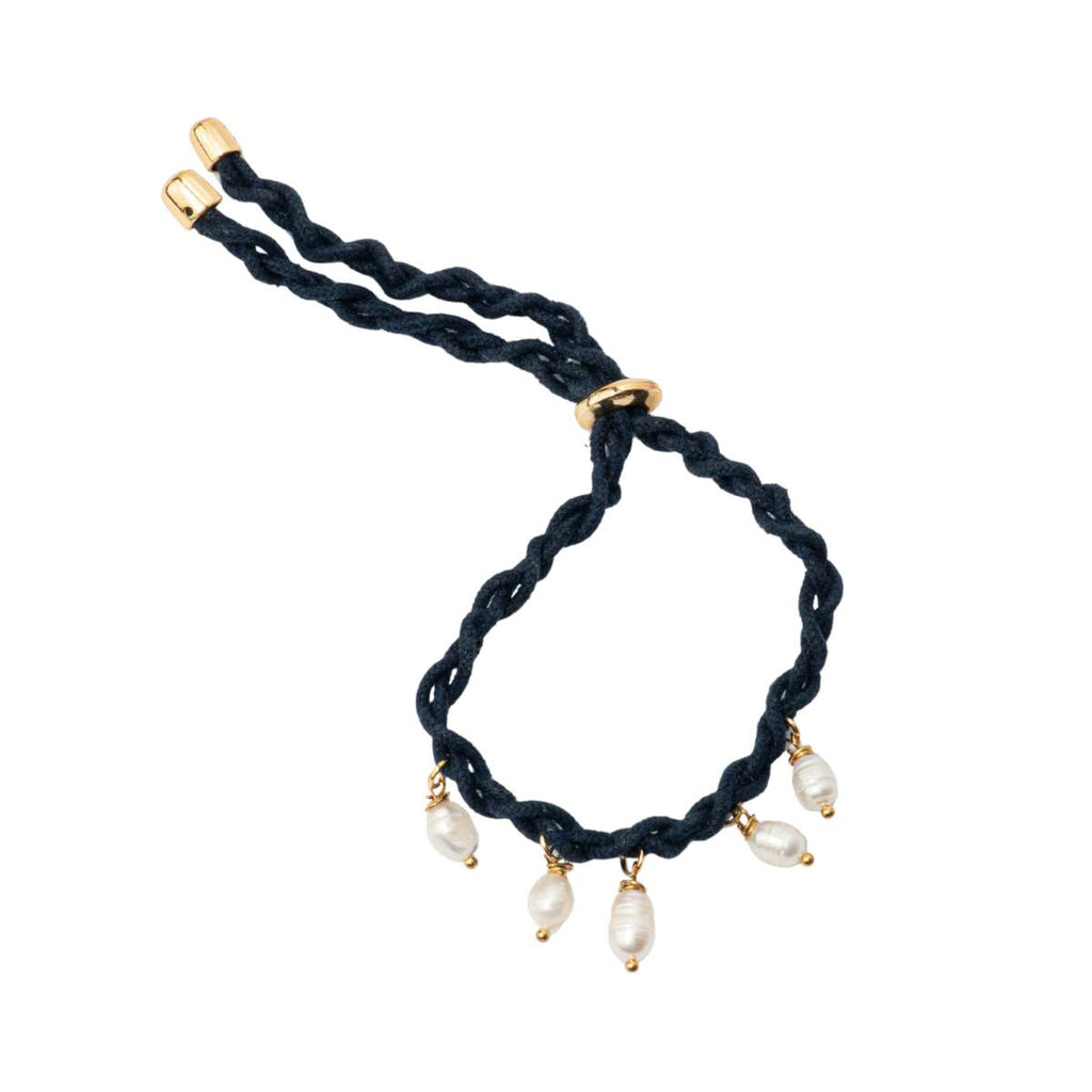 Pulseira em fio azul trançado com aplicação de pérolas .