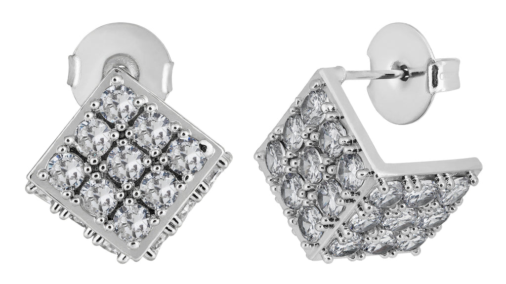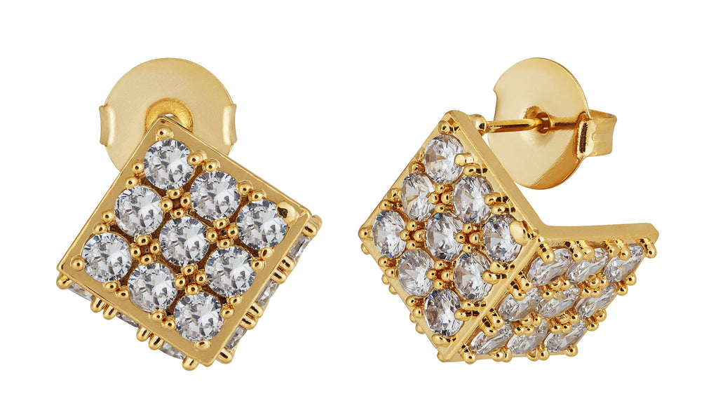 Brinco em formato de cubo com acabamento dourado ou Ródio branco e cravação delicada, que garante brilho uniforme e um visual sofisticado.