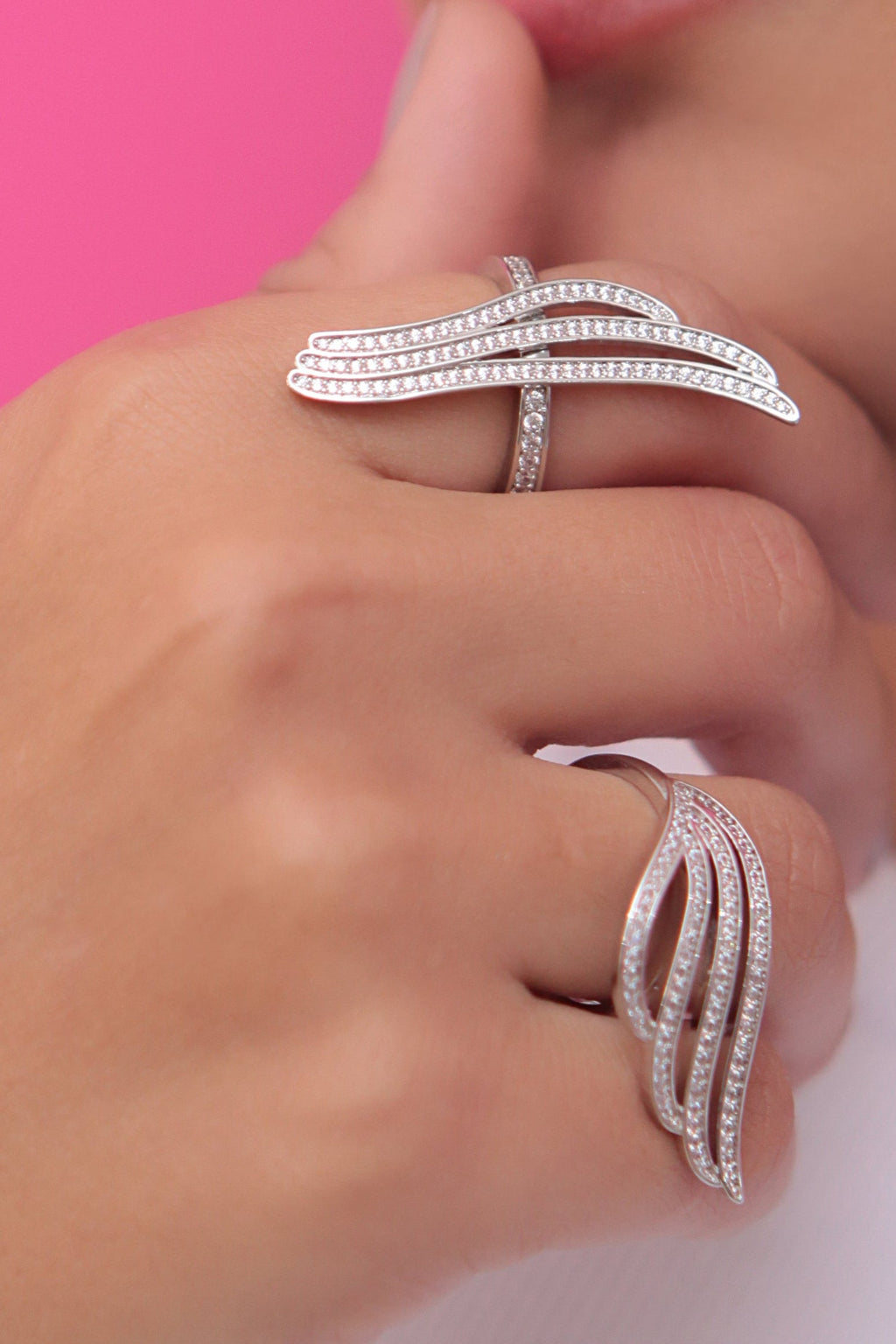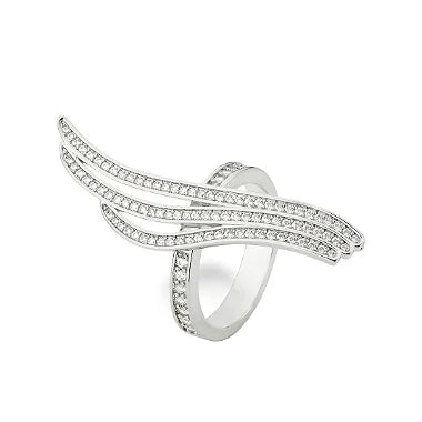 Design: Três linhas delicadamente cravejadas se entrelaçam como asas em movimento. Um anel com presença marcante, brilho intenso e traços que evocam liberdade, leveza e força feminina.