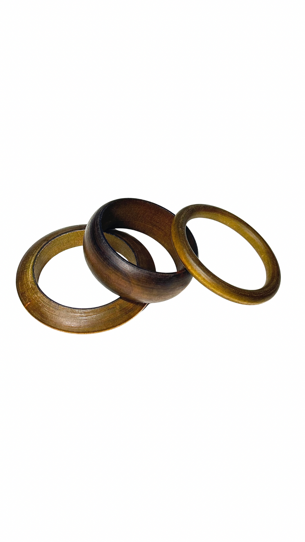 Conjunto com três braceletes em madeira natural, com acabamento liso e tonalidades orgânicas que valorizam os veios e a textura do material.
