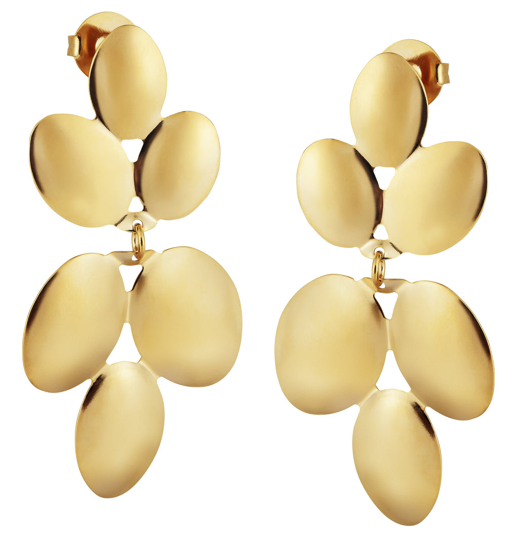 O Brinco 6 Folhas Ovais Opya é uma semijoia banhada a ouro, com design fluido e acabamento polido.