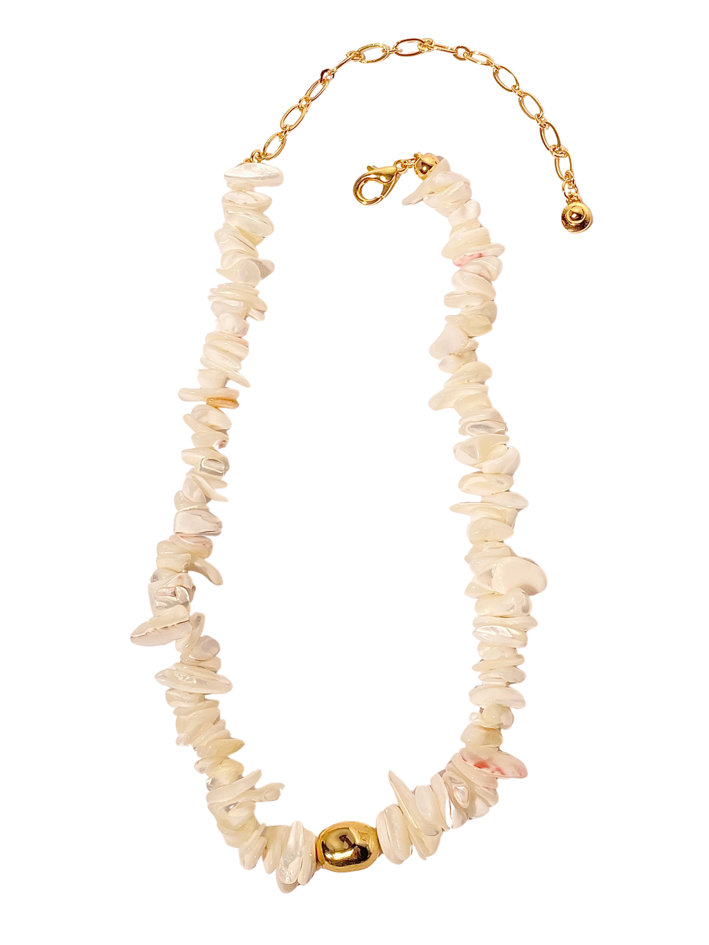 Colar composto por cascalhos de madrepérola natural, com acabamento orgânico e brilho suave.
